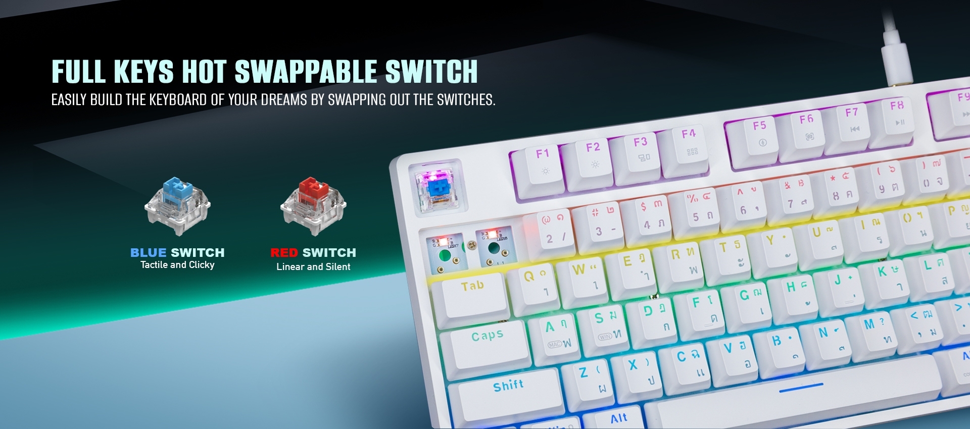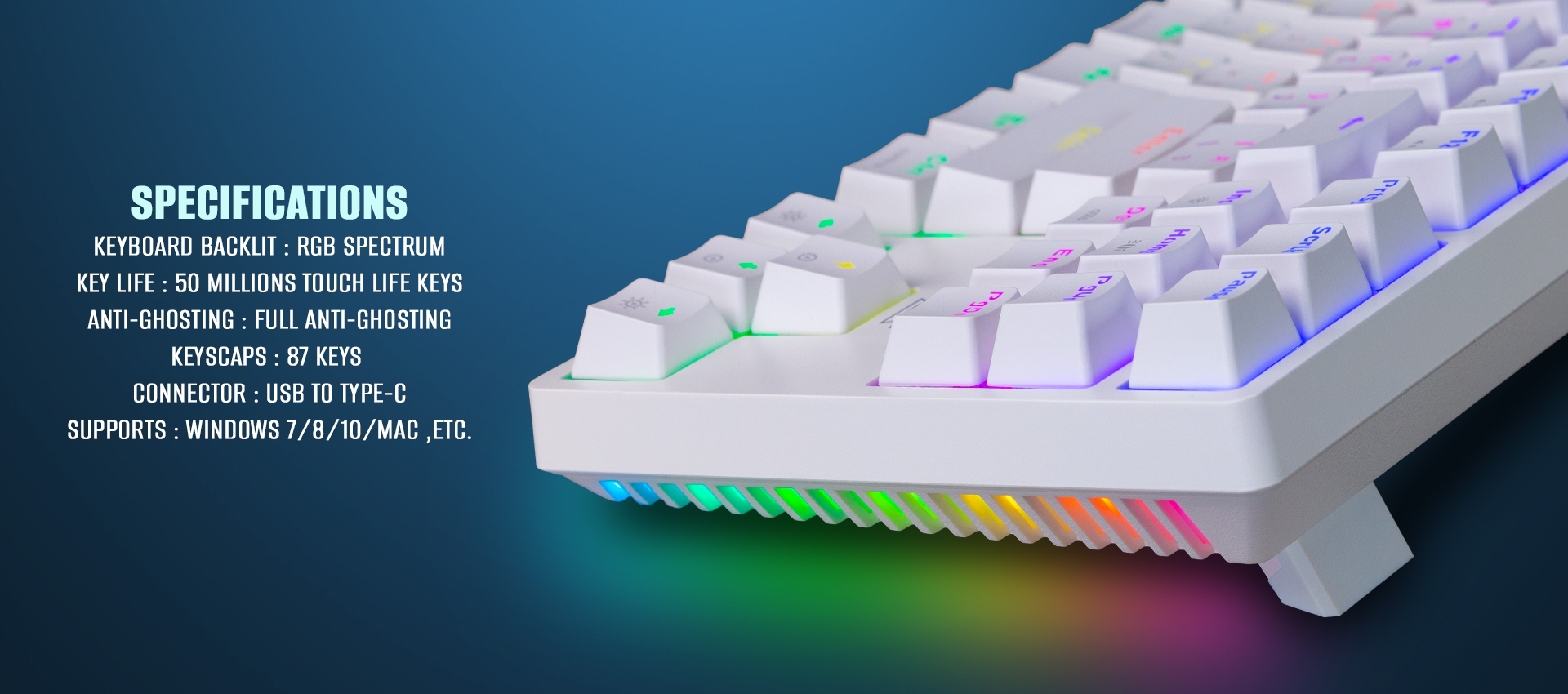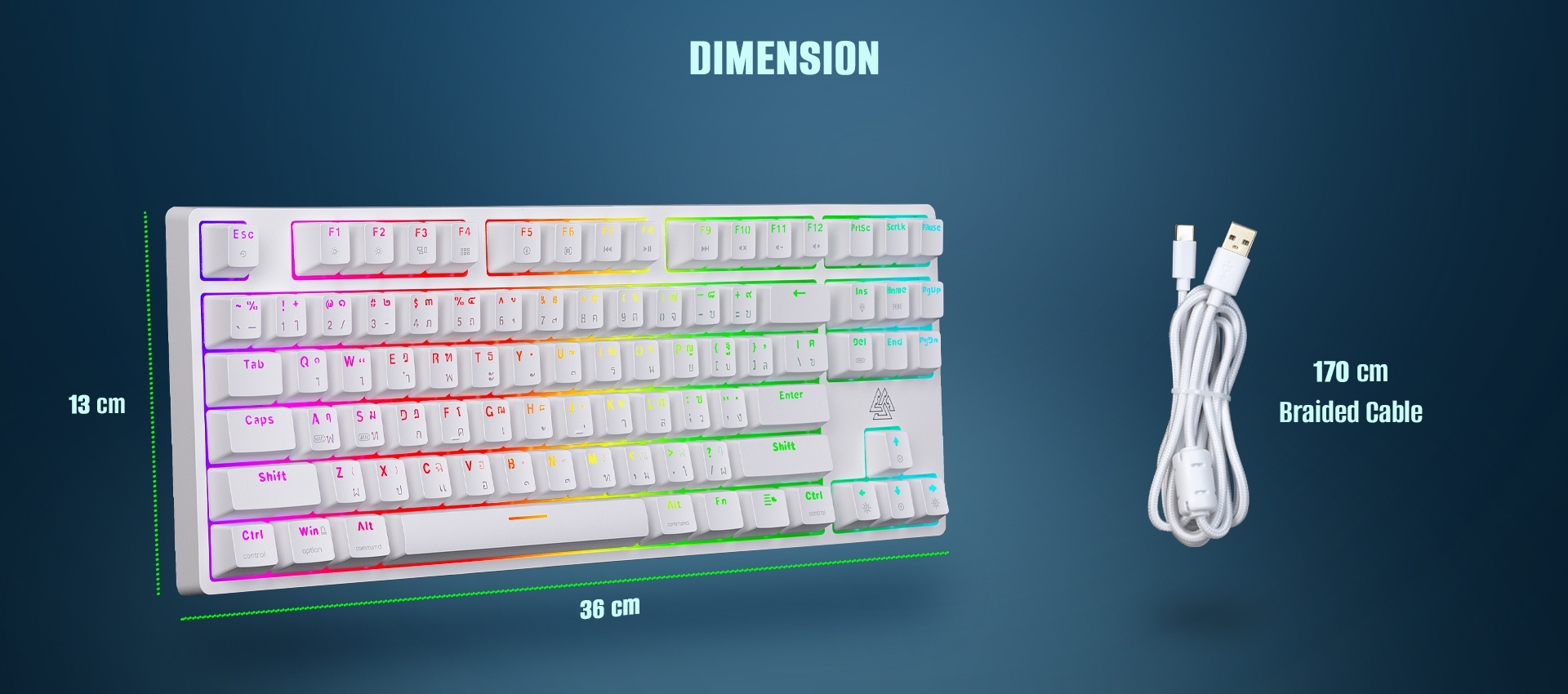 คีย์บอร์ดเกมมิ่ง รุ่น TYPE CMK2 เป็นไฟ RGB Spectrum ปรับได้ 20 โหมด ง่ายต่อการปรับเปลี่ยนสวิตซ์ตามที่ต้องการ ยังมีระบบ Anti-Ghosting เต็ม 87 ปุ่ม มาให้ด้วย และรองรับการกดปุ่มใช้งานได้มากถึง 50 ล้านครั้ง รวมถึงรองรับการใช้งาน Windows 7 / 8 / 10 / Mac , ETC ตัวสายเชื่อมต่อแบบ USB to Type-C ความยาวสายเชื่อมต่อ 170 เซนติเมตร ครบหมดทุกการใช้งาน